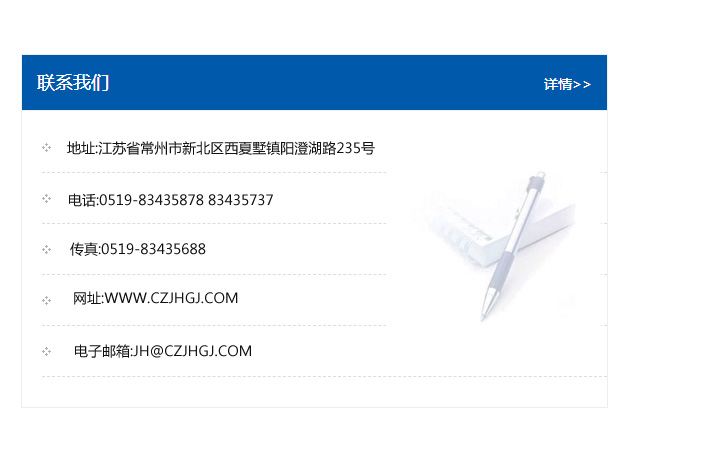 地址:常州市新北區友邦商務大廈1幢16、17層  電話:0519-85101652  傳真:0519-85112595  郵編:213022  網址:www.cz-jiayue_cn.data-ceo.com  郵箱:xiajifengaa@163.com